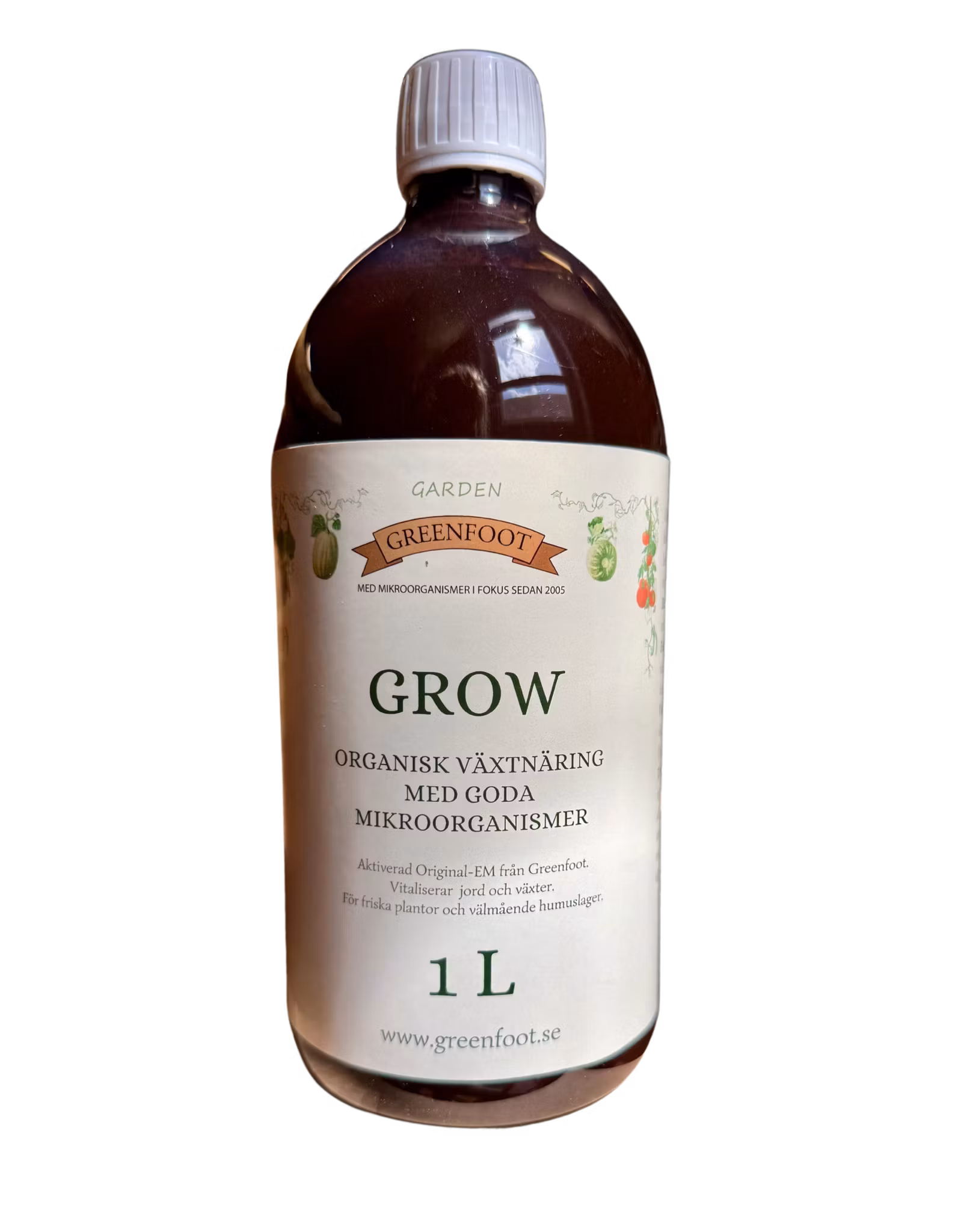 GROW från Greenfoot Garden är ett flytande biodynamiskt och organiskt gödsel med bra NPK-värde. GROW innehåller effektiva mikroorganismer, humussyror och värdefulla fulvinsyror som hjälper näringsupptaget av värdefulla makro- och mikromineraler.